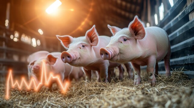 Pigs in a barn interacting among straw with a visible heartbeat monitor at a farm during the evening
