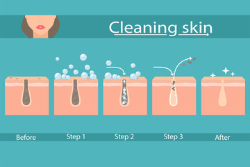 Facial skin care, pore cleaning. Cleansing stages on clogged face. Skin cleaning steps. Vector illustration.