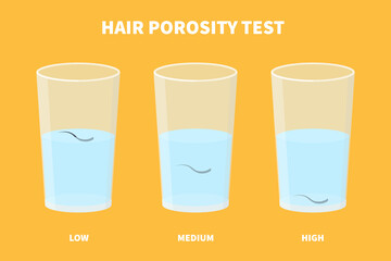 Natural hair porosity float test infographics. Strand with low, normal and high cuticle porosity in a glass of water. Anatomical structure scheme. Cartoon vector illustration.