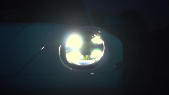 Detail on one of the LED headlights super car on black background, free space on right side for text