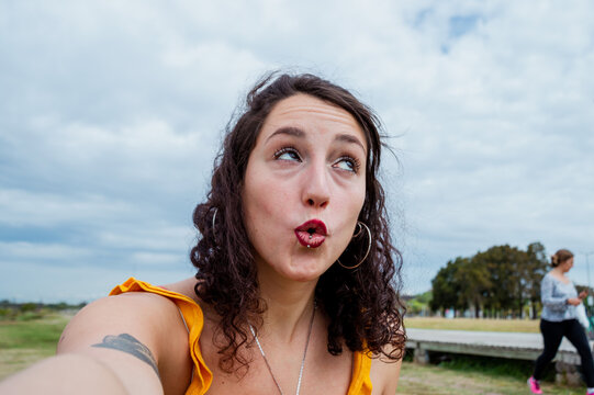 Portrait of a young diverse biracial couple taking a selfie at the beach and having fun outside. Portrait of a young diverse biracial couple taking a selfie at the beach and having fun outside.