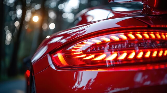 Detailed view of the LED taillight of a modern red sports car, emphasizing design and technology