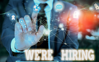 Writing note showing We Re Hiring. Business concept for process of reviewing applications and finding candidates Picture photo network scheme with modern smart device