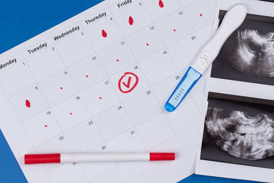 Positive pregnancy test, gynecological ultrasound image and ovulation calendar marked with menstruation and ovulation dates. Fertility tracking, family planning, maternal health, and prenatal care.