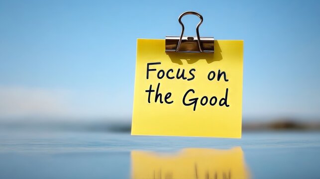 Focus on the Good Yellow Sticky Note with Inspirational Message and Water Reflection