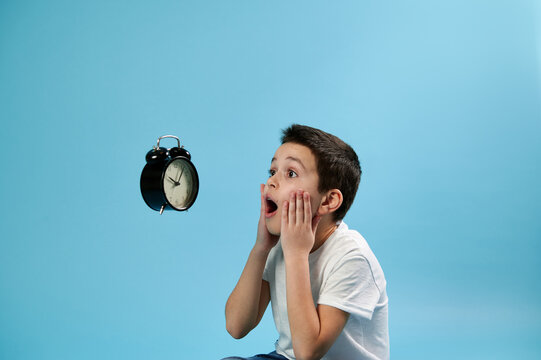A shocked schoolboy looks with horror at a flying alarm clock and holds his face with his hands. Time management concept, deadline.