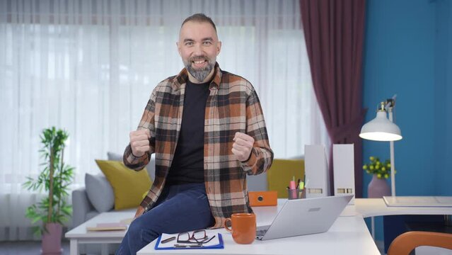 A cheerful man reacts positively while using a smartphone in a cozy living room setting.