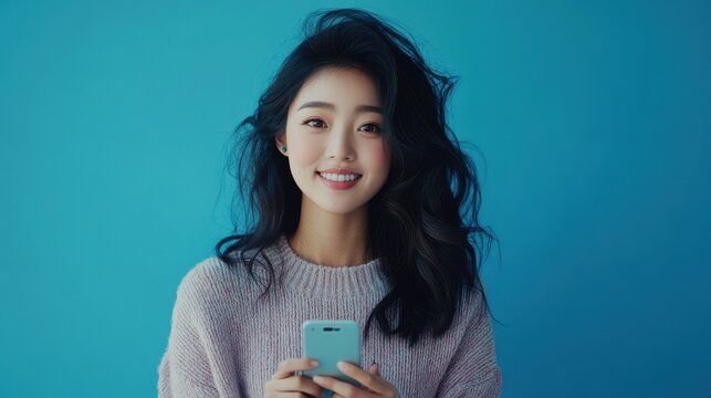 Beautiful Asian woman holds modern cellular glad to surf in social networks smiles positively dressed in casual jumper poses against blue background. Technology and online communication concept