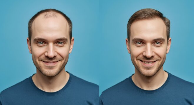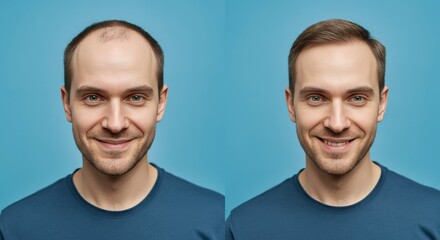 Before and after hair transformation of young caucasian male on blue background for personal care and confidence