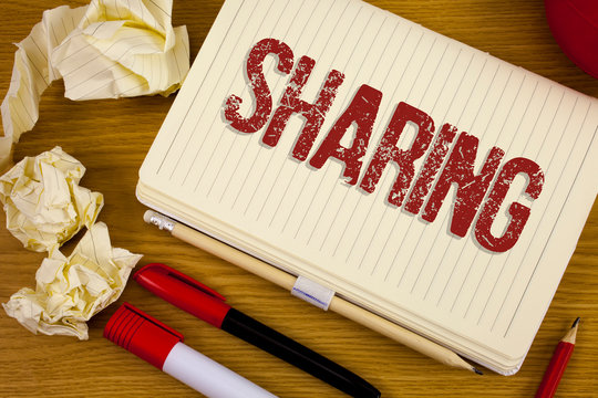 Conceptual hand writing showing Sharing. Business photo showcasing To Share Give a portion of something to another Possess in common written Notebook Book the wooden background Pen Pencil.