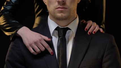 Female hand hugging man, showing control in relationship, manipulation concept