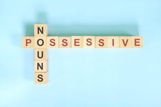 Possessive nouns concept in English grammar education. Wooden block crossword puzzle flat lay in blue background.