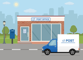 Post office building, delivery truck and mailbox on city background. Flat style, vector illustration.