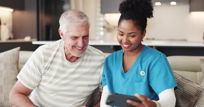 Old man, nurse and selfie on sofa, smile and relax with bonding, memory or retirement in home. People, caregiver and profile picture with photography, post or social network on couch at apartment