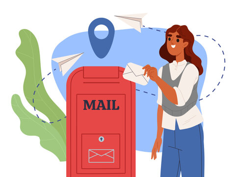 Girl sends message concept. Woman put envelope with letter to mail. Postal service for friendly and business correspondence. International communication. Cartoon flat vector illustration