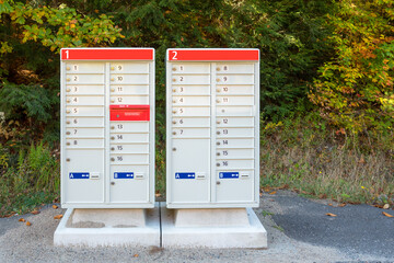 Numbered community mailboxes along a road in the countryside on sunny autumn day