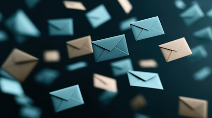 Floating blue and brown envelopes in a dark, blurred background conveying the concept of communication and mail delivery in a digital context.