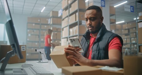 African American logistics manager scans parcels using smartphone, works in postal service warehouse. Sorting center employees carrying cardboard boxes for shipping. Storage with E-commerce orders.