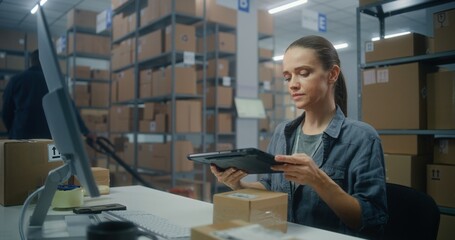Female Customer Support Specialist in Logistics, Manager Talks with Client on Phone, Uses Tablet Computer. Warehouse Employee Working in Background. Delivery Service of E-Commerce Store. Close Up.