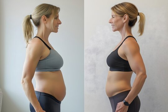 Before and after comparison of a woman’s body transformation from pregnancy to fit, healthy physique, side view. Fitness, postpartum recovery, health improvement concept