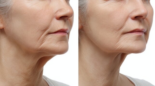 Bottom of an older woman s face and neck showing skin aging effects pre and post facelift on a white background Revitalization of loose skin wrinkles and lines