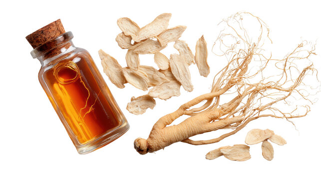 Ginseng root, slices, and extract in a glass vial on a white isolate background.