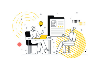 HR manager concept with people scene in the flat line cartoon style. The manager interviews potential job candidates. Vector illustration.