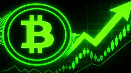 Bitcoin symbol glowing bright green next to an upward trending candlestick chart indicating massive cryptocurrency market growth digital finance success profit investment surge future potential