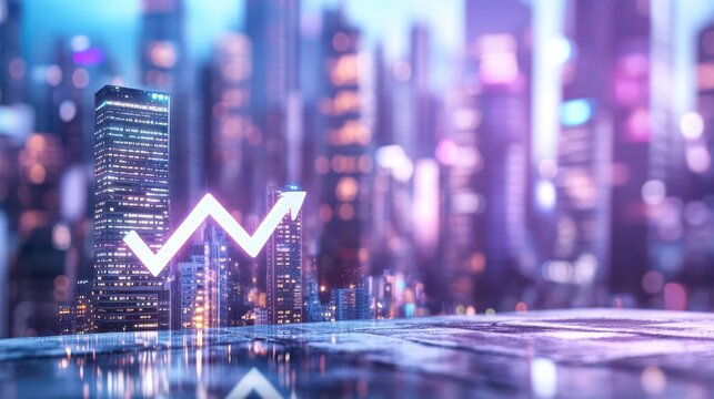 Financial Growth in the City: A digital image of a financial graph symbolizing the growth in a city, the lights of city is on, a neon symbol of arrow in upward direction.