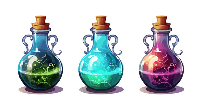 Love potions collection. Different-shaped glass jars with elixirs. Alchemy elements set. Vintage flask and bottle bundle isolated on white. Valentine's day related hand drawn flat vector illustration
