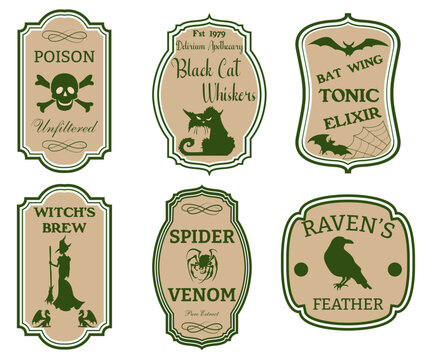 Modern witchcraft concept header. Blank label on a magic potion bottle. Potions, berries, herbs and occult equipment. Magical still life with copy space on a dark background.