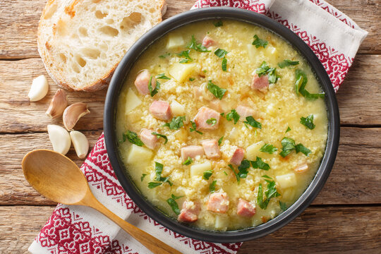 Kulesh is Ukrainian dish, popularized by Zaporizhian Cossacks this pottage, made of millet, salo, potatoes and onions close-up in a plate on the table. horizontal top view from above