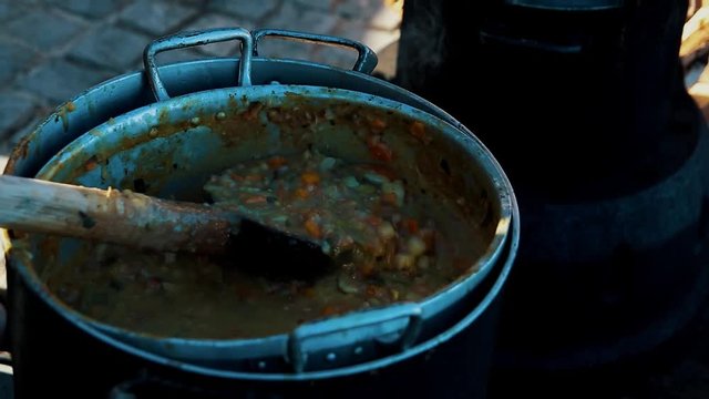 a female sewer pours soup into a clay mold bowl with a wooden spartle from a large saucepan outdoor. Medieval cusine, refugee camp, outdoor feeding concept, traditional cooking, Pirate food pottage