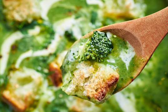 Fresh creamy broccoli soup closeup. Closeup of green healthy vegan broccoli soup in spoon.