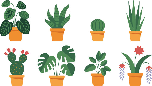 Flat vector set of potted indoor plants, flowering cacti, and tropical greenery. Ideal for botanical design, nature art, and home decor.