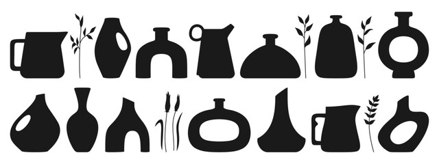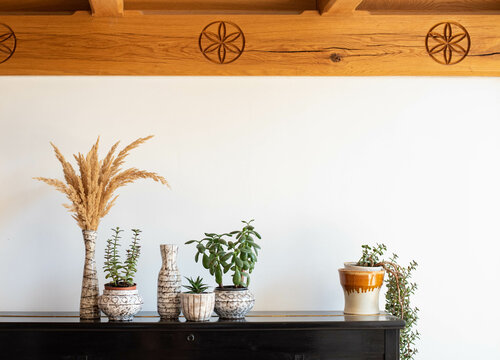 Mid-century modern pottery set - grey pots and a vases with plants on a black wooden table under wooden beams