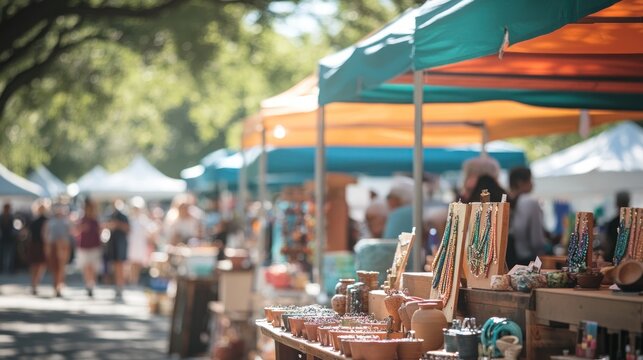 blurred backdrop of a beautiful market stall filled with handcrafted items at a seasonal fair. Springtime events and celebrations, outdoor markets and festivals