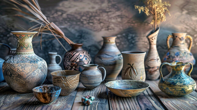 Collection of ancient greek pottery, featuring intricate designs and patterns, carefully arranged on display in a museum