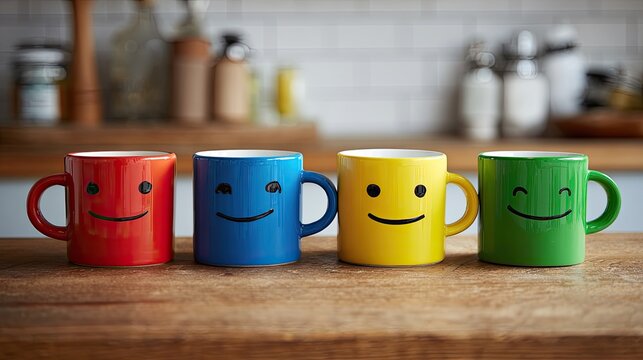 Colorful mugs with smiley faces on a wooden kitchen table for a cheerful morning coffee experience