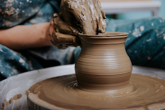 Potter working on a Potter's wheel making a vase. Master processing the formed jug giving it the correct shape