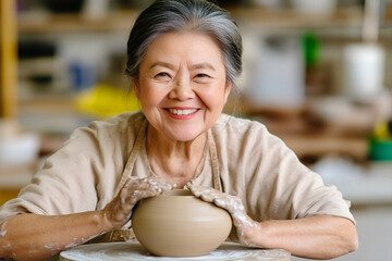 Elderly Asian woman in beige clothing creates a clay pot on a pottery wheel, emphasizing her mastery of the craft and artistic heritage.