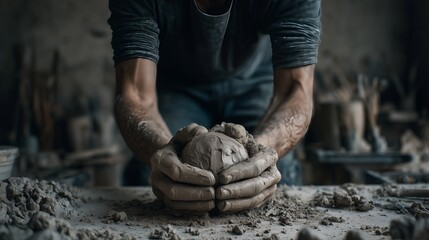 Male artisan shaping clay with hands in a pottery studio, showcasing craftsmanship and creativity