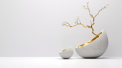A cracked and broken white ceramic cup with pieces scattered around it, against a plain background.