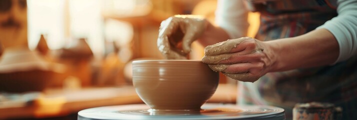 Crafting a clay bowl on a pottery wheel during an afternoon session in a cozy ceramic studio. Copy space