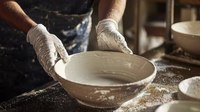 Crafting a ceramic bowl in a pottery studio using traditional techniques and tools in a creative workspace