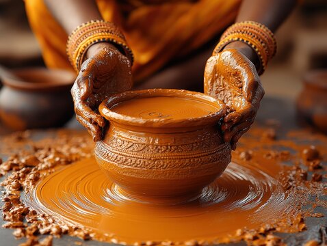 Skilled hands shaping clay on a potter's wheel, creating a beautiful, handcrafted pot.  Artisan craftsmanship and traditional pottery techniques.