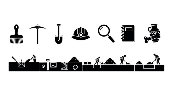 Black silhouette icons depicting various archeology tools and activities, including a brush, pickaxe, shovel, hard hat, magnifying glass, notebook, and ancient pottery.