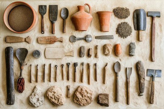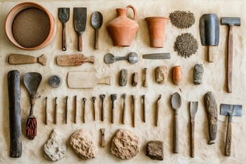 Pottery tools and clay pots on a workbench in a pottery studio Concept of craftsmanship, handmade, and ceramics