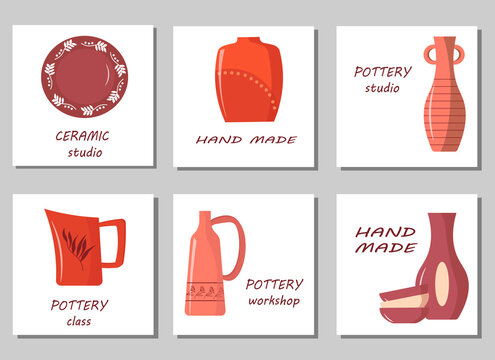 Postcards, cards set, Pottery workshop concept, invitation, pottery party. Hand drawn flat vector illustration.