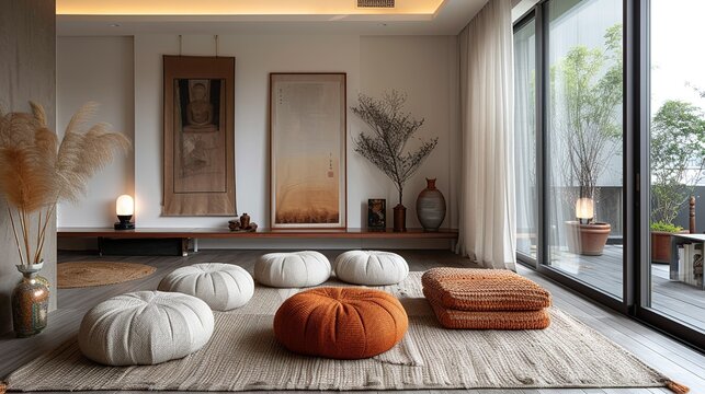 A modern pouf or floor cushion, adding a casual and comfortable seating option that complements the living room decor. shiny, Minimal and Simple,